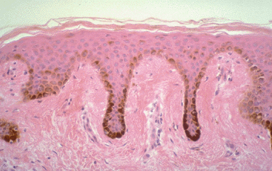 Micro 50. LM of stratified squamous epithelium, keratinized (skin). This type of epithelium is primarily found in skin, forming dry surfaces that resist ehydration.