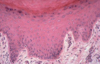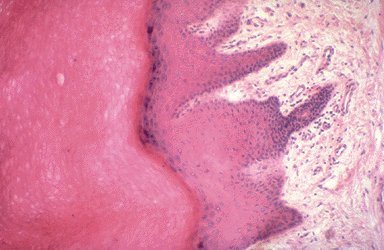 Micro 51. LM of stratified squamous epithelium, keratinized (skin). Although the full thickness of the epithelium is not shown, note that this epithelium has much more keratin than that shown in the previous Micro.