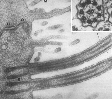 Micro 57. TEM of cilium (trachea) . (Kelly et al., Bailey's Textbook of Microscopic Anatomy, 1984). Note the basal bodies (B) and their continuity with the microtubules that comprise the ciliary core. Note the organization of the doublet microtubules evident in the cross sections (upper right). Ij = intermediate junction; Oj = occluding (tight) junction; M = microvilli.