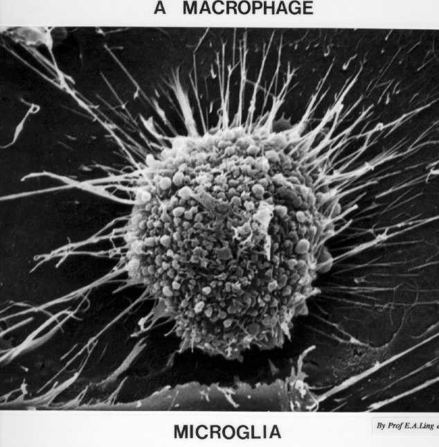 A macrophage in SEM. The cell is characterized by many spiny filopodial processes. Numerous blebs are present.