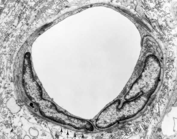 Simple squamous epithelium(endothelium) lining the lumen of a blood capillary. Could you recognize the cell junctions between the two cells? What do the arrows indicate?