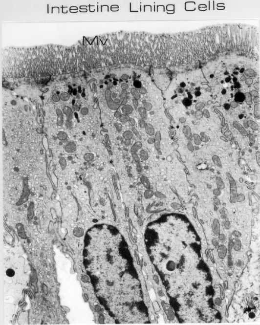Simple columnar epithelium lining the mucosa of small intestine. Identify the nuclei of the lining cells. Note the microvilli(Mv) refered to as brush border in light microscopy.