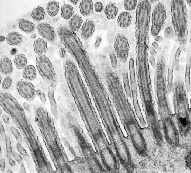 Showing cilia lining the mucosa of trachea seen under TEM. Identify the axonemes(microtubules) and basal bodies of the cilia. Identify also the microvilli present between the cilia.