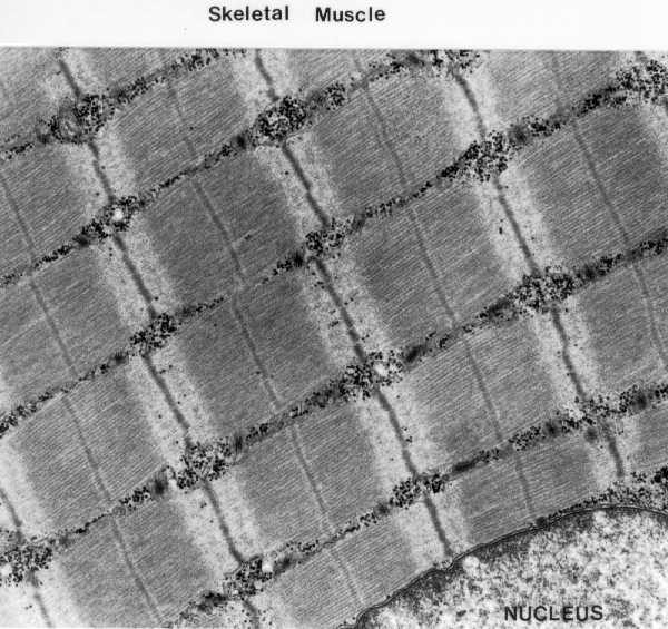 Portion of a skeletal muscle cell(fibre). The nucleus is at the lower part