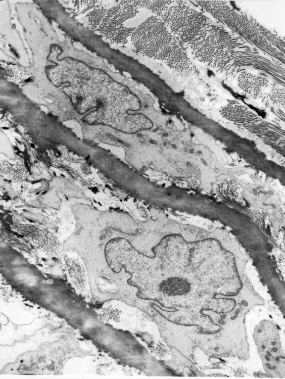 Smooth muscle cells between the elastic laminae(darkly stained) in an elastic artery(aorta).