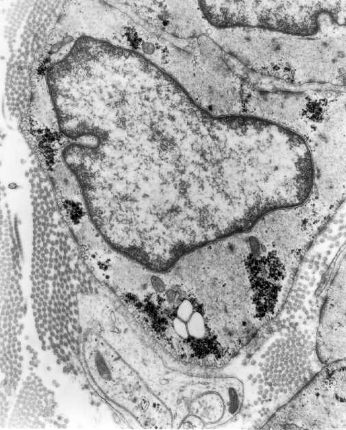 Transverse section of a smooth muscle fibre. Its nucleus is centrally located. In the sarcoplasm are myofilaments and masses of glycogen particles. Numerous caveolae are clearly seen at the membrane.