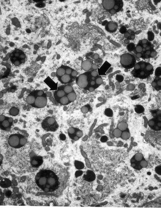 Portion of a neuron showing lipofuschin granules(arrows) and profiles of rough endoplasmic reticulum. Can you recognize any other organelles in the field?