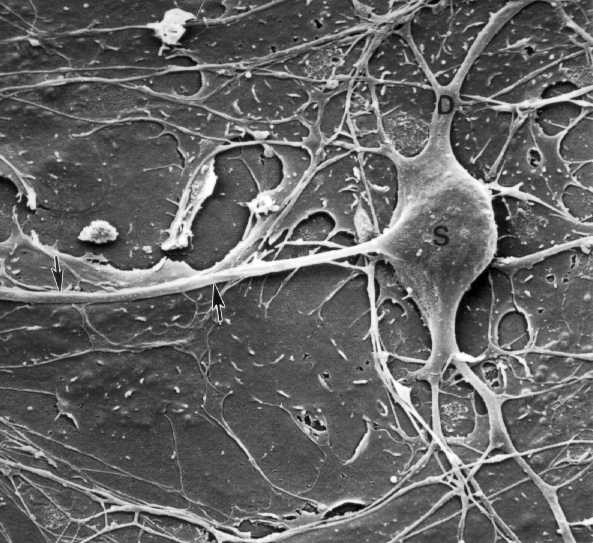A neuron in culture. A long slender axon(arrows) projects to the left of the figure. Three branching dendrites(D) project from the cell body(S).
