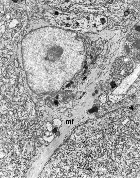 An astrocyte. Identify the bundles of microfilaments(mf) in its cytoplasm.