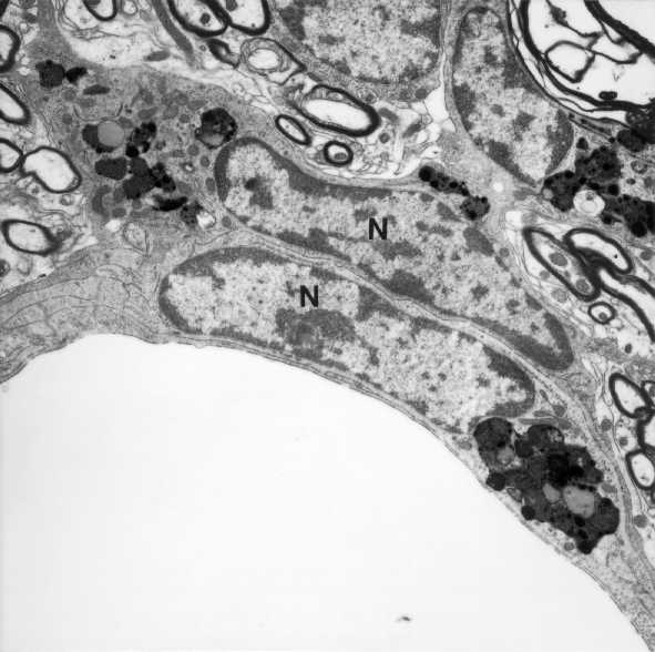 Elongated microglial cells. The flattened nucleus(N) shows dense chromatin masses. The cytoplasm contains lipofuschin granules.