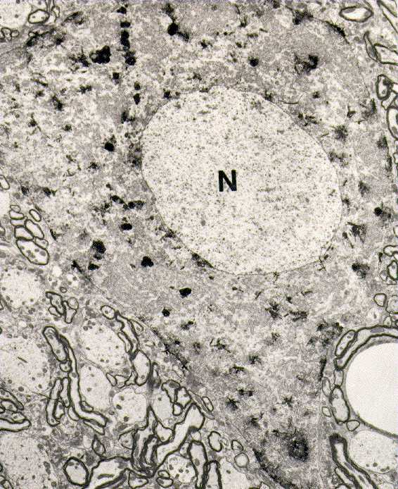 A motor neuron is labelled with horseradish peroxidase(HRP) (dark deposit) when injected into the peripheral nerve. N, nucleus.