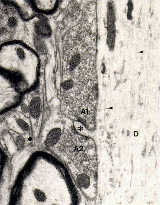 Two axon terminals(A1, A2) containing synaptic vesicles form synaptic contacts with a dendritic spine(asterisk). D, dendrite. Arrow heads indicate neurotubules in dendrite.