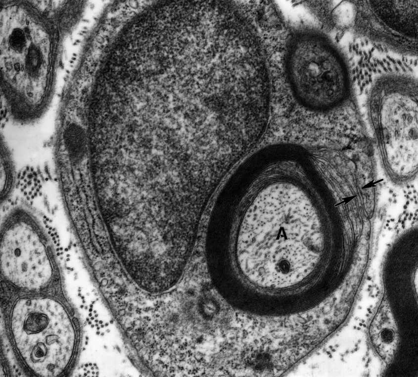 Showing an axon(A). Myelination is in progress. What do the arrows indicate? Identify the nucleus of the Schwann cell.