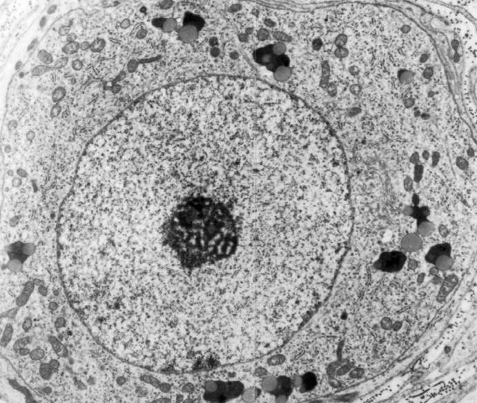 A prominent nucleolus is located in the centre. In the cytoplasm, identify the lipofuschin granules, rough endoplasmic reticulum (rER) and mitochondria.