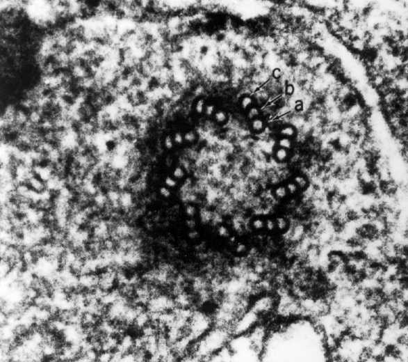 A high magnification electron micrograph showing a centriole in transverse section. Its wall is made up of 9 sets of triplets. Each triplet is composed of 3 subunits: a, b, and c, which form a microtubule.
