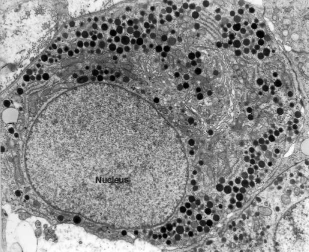 An endocrine cell contains numerous secretory granules (hormone). Locate the Golgi apparatus in this cell.