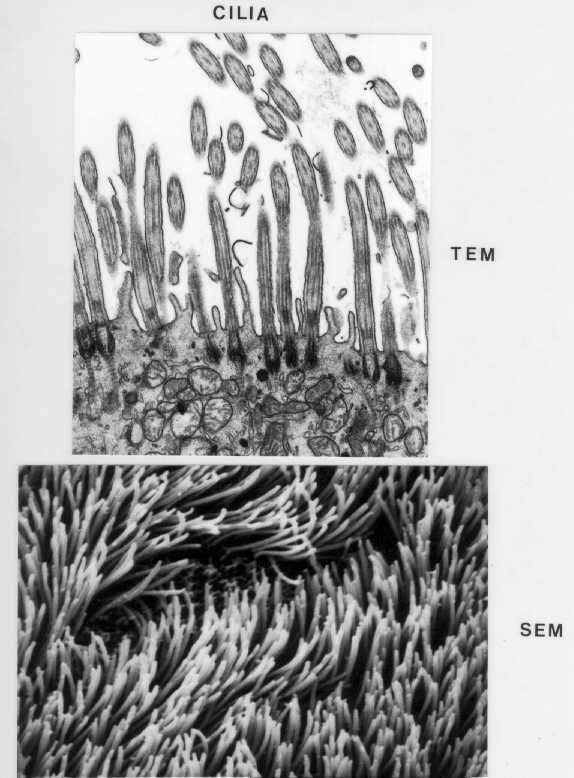 Cilia lining the trachea under transmission electron microscopy (TEM) and scanning electron microscopy (SEM).