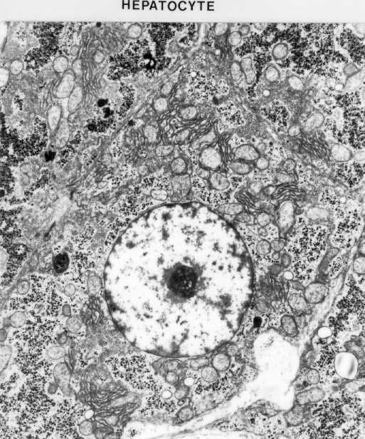 Hepatocyte. Identify its nucleus, nucleolus, chromatin clumps, glycogen masses (dark masses), mitochondria and rER.
